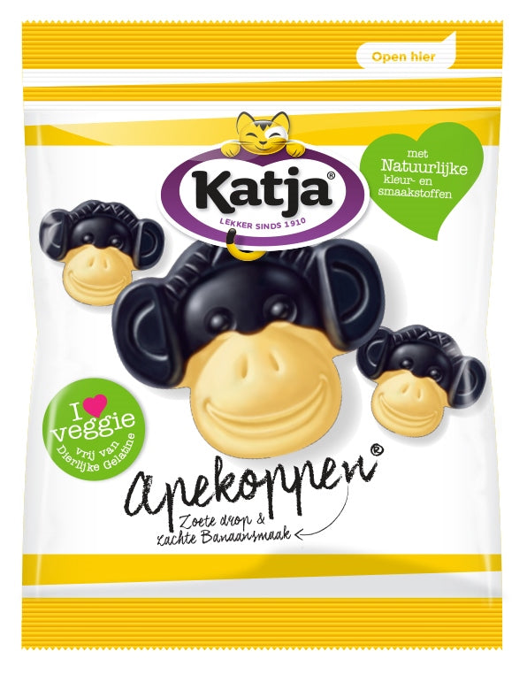 Ben je klaar voor een swingend snoepfestijn? Probeer dan de Katja Apekoppen, en laat je meevoeren op een smaakavontuur diep in de jungle van genot! Met 65 gram van deze zalige apekoppen proef je de perfecte combinatie van de zoetheid van banaan en het plezier van vegan snoepen.