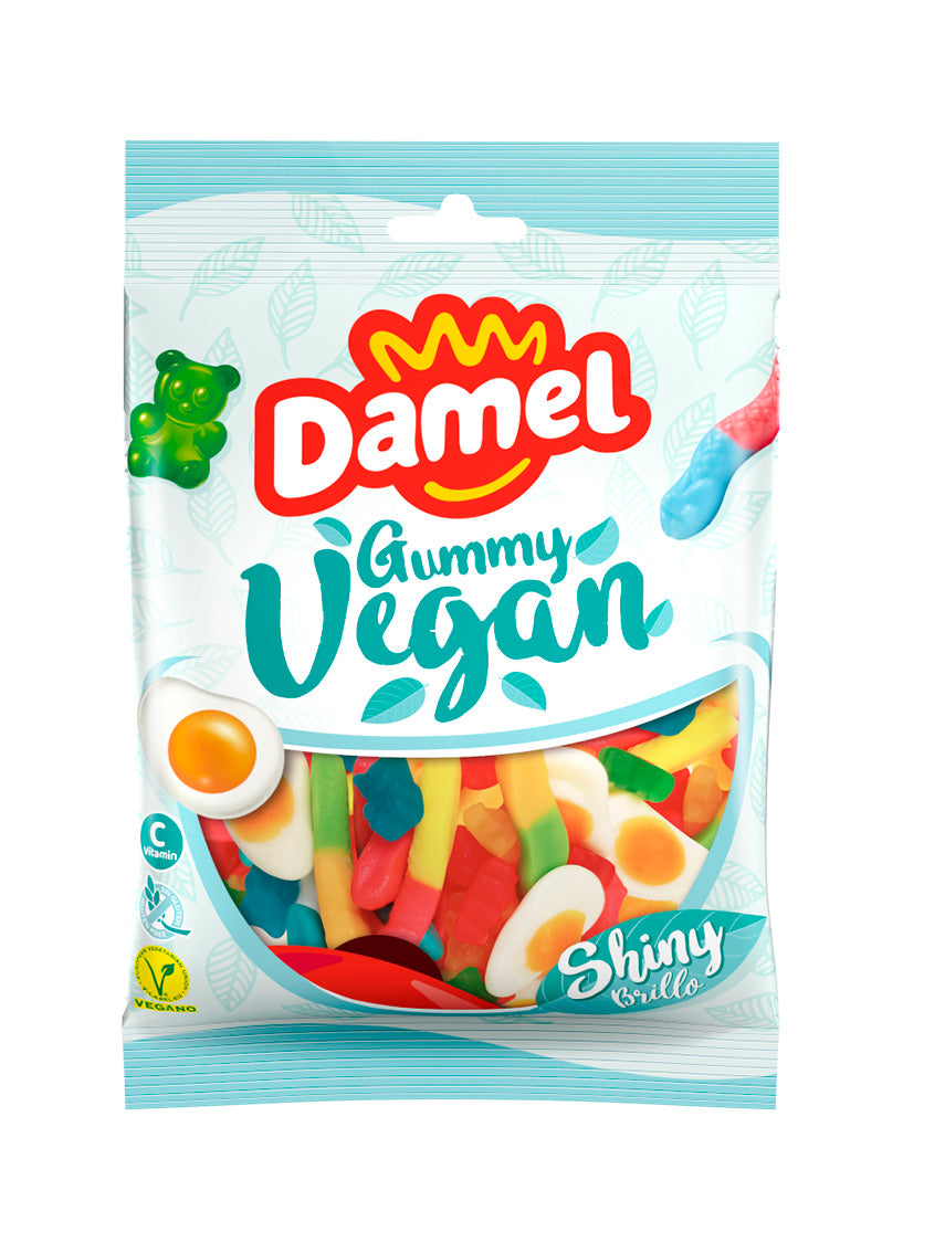 De Shiny Mix Vegan van Damel in een zakje van 120 gram. Een zakje gevuld met lekkere vegan gummysnoepjes, in allerlei vormen en smaken.
