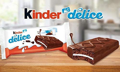 Kinder Delice: zachte cacao cake omhuld met melkchocolade en een romige melkvulling, verpakt per 10 cakes.