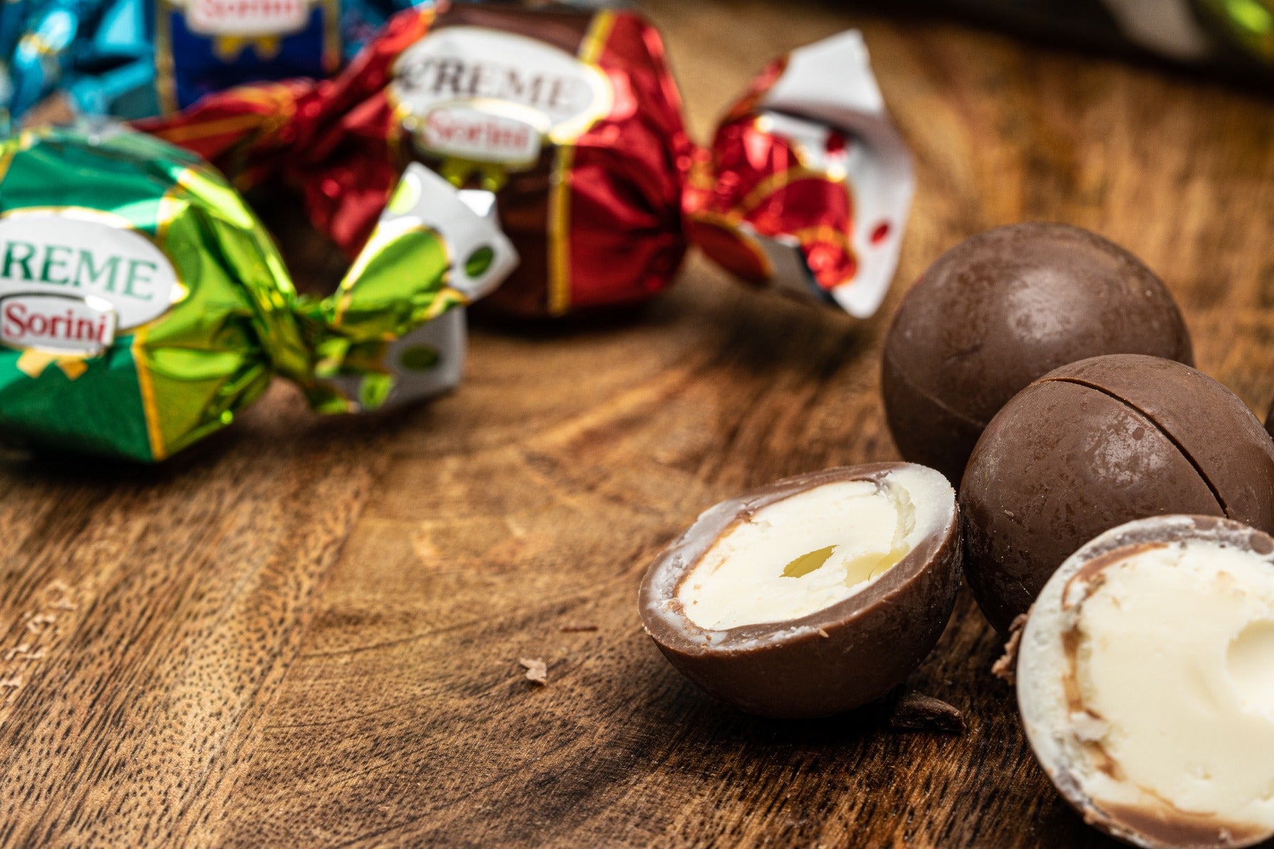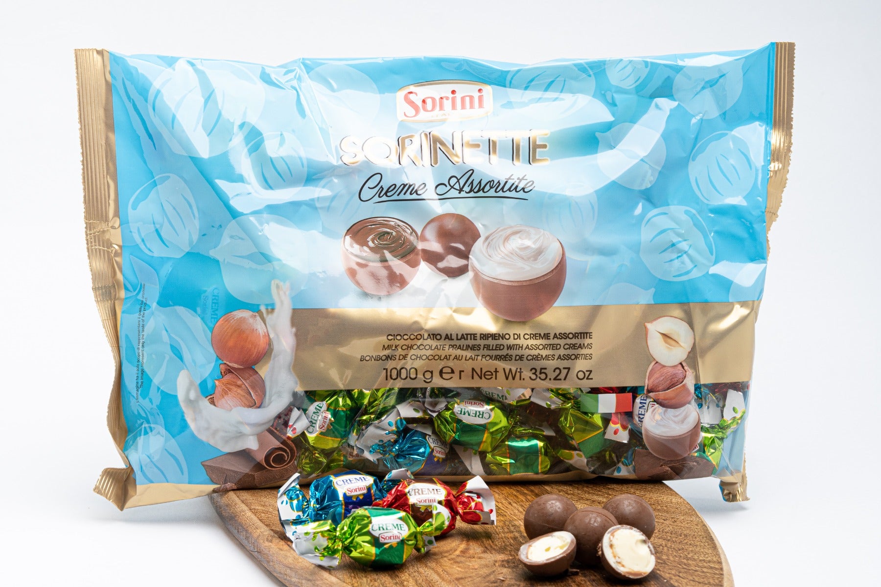 Mix van verschillende kleuren melk chocolade pralines met hazelnoot cremevulling. Deze grootverpakking bevat ongeveer 65 per stuk verpakte pralines.