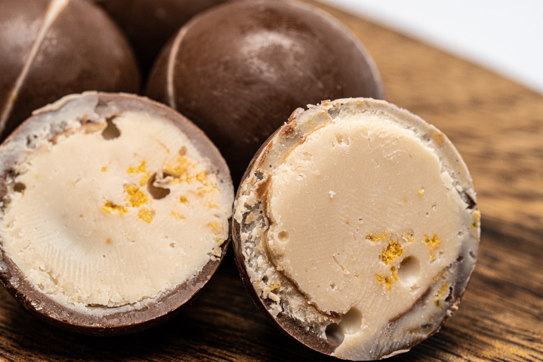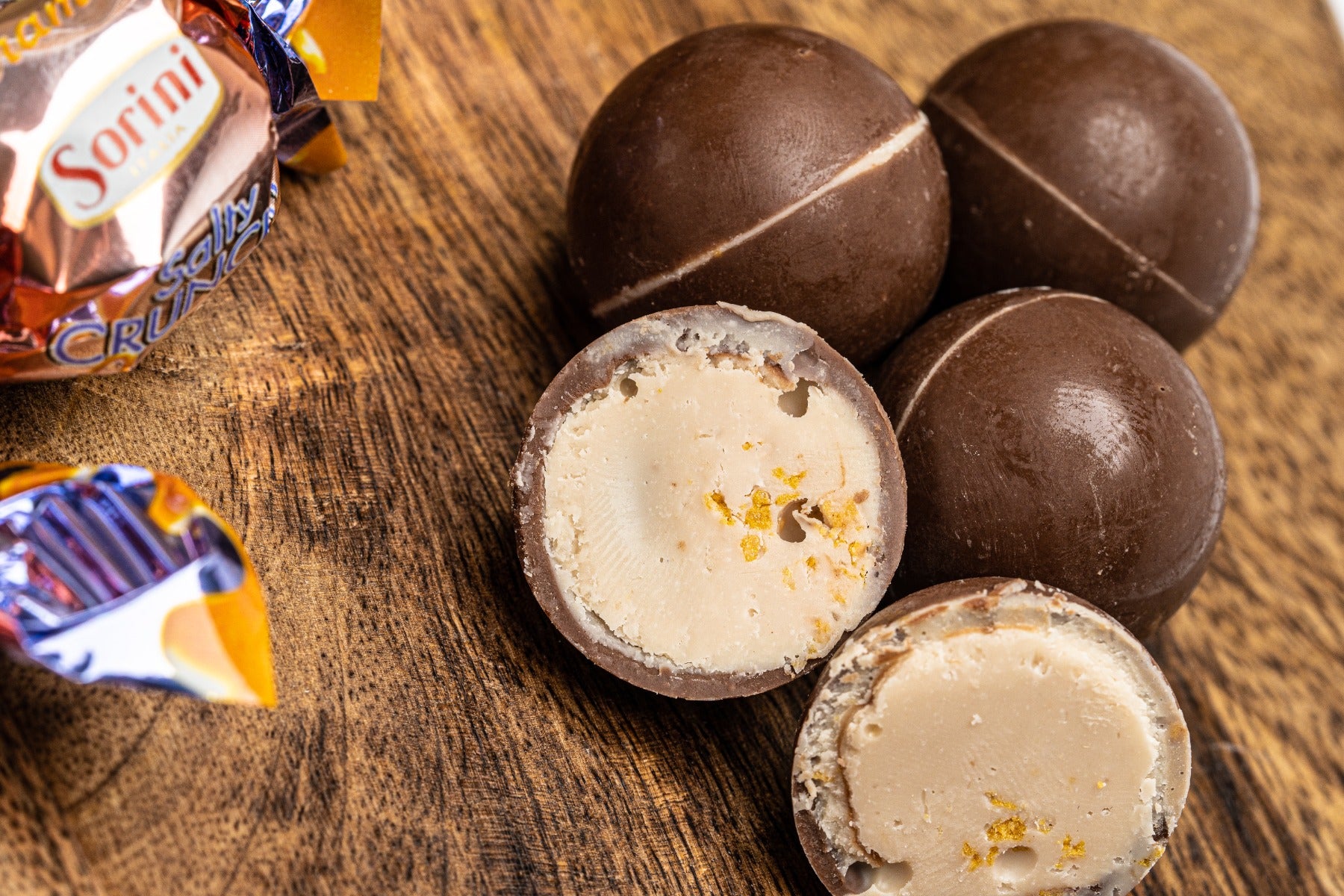 Melk chocolade pralines met een vulling van gezouten hazelnootcreme. Deze grootverpakking van 1 kilo bevat ongeveer 65 per stuk verpakte pralines.