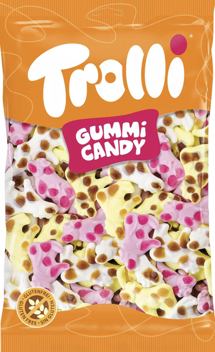 Trolli Koeien verpakt in grootverpakking van 1 kilo. Zachte rommige fruitgum snoepjes in verschillende kleuren gespikkelde koeien.